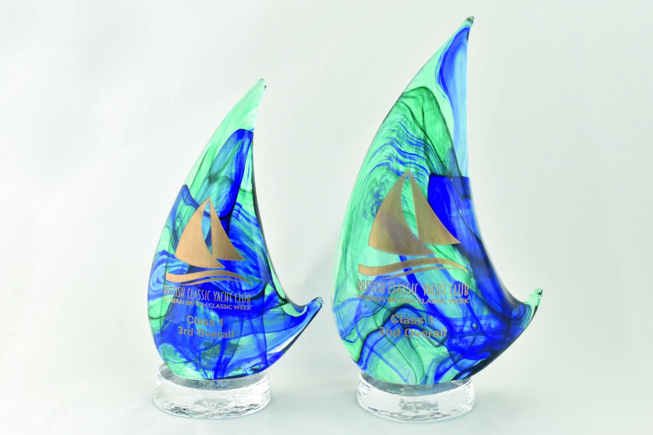 Blue swirl Sails on oval bases with gold fill engraving