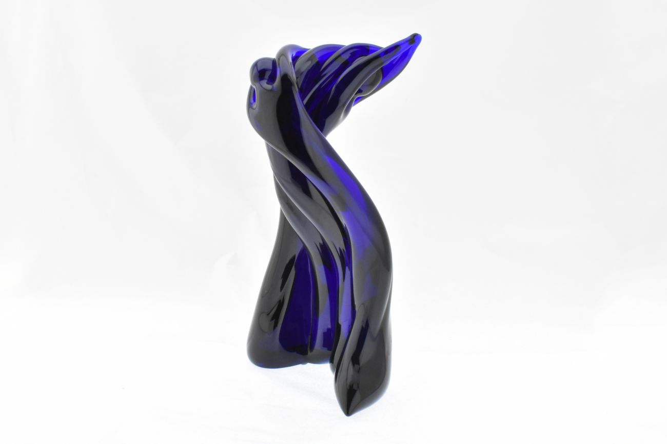 Studio art glass twisting figurative sculpture in deep blue. Sculpted from recycled glass coloured with cobalt oxide. Height is 24cm
