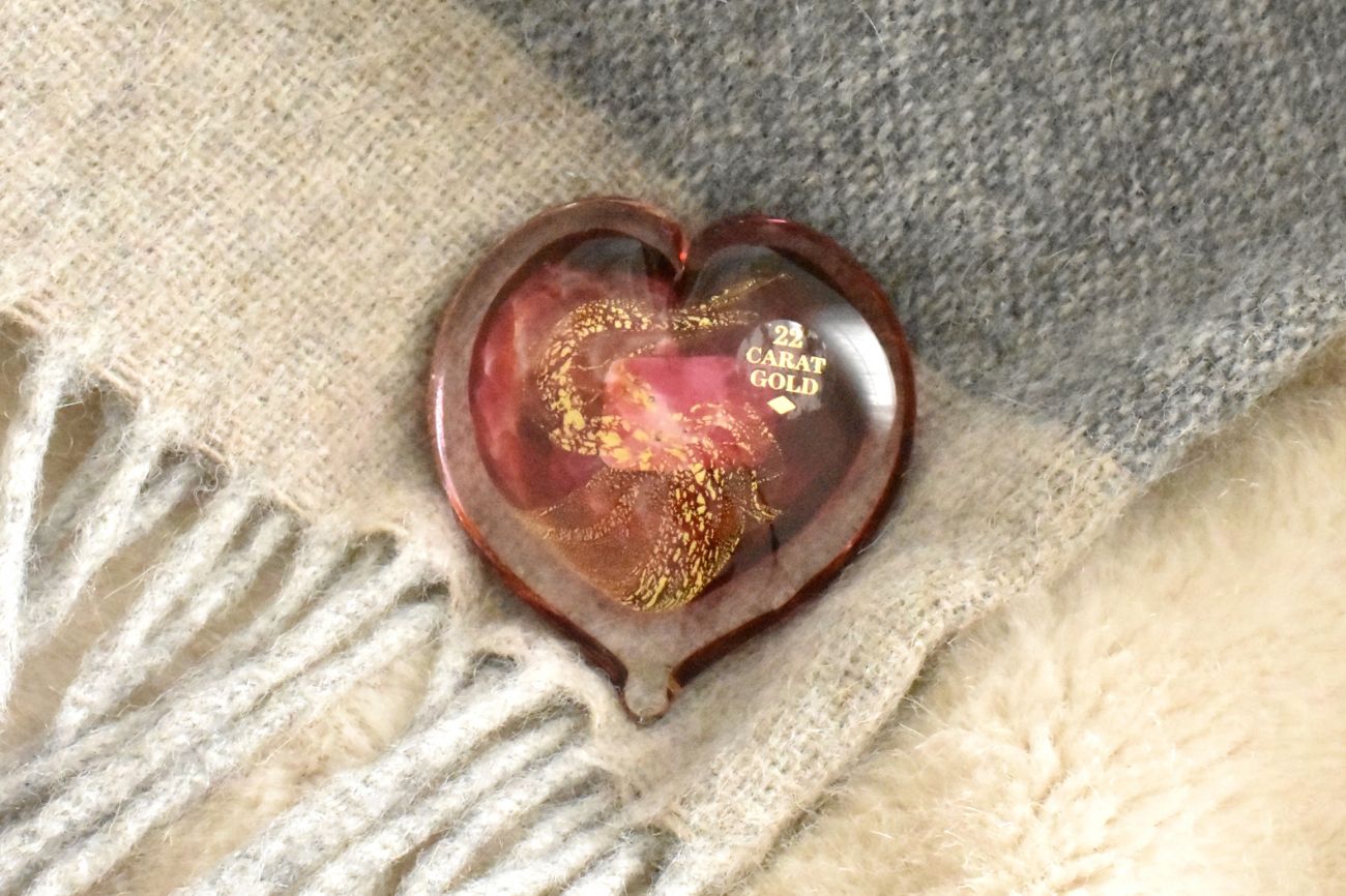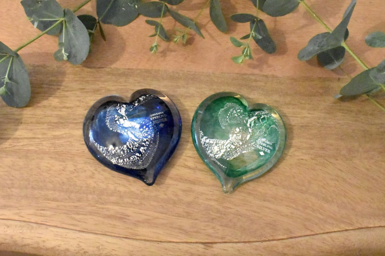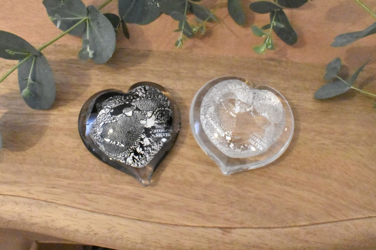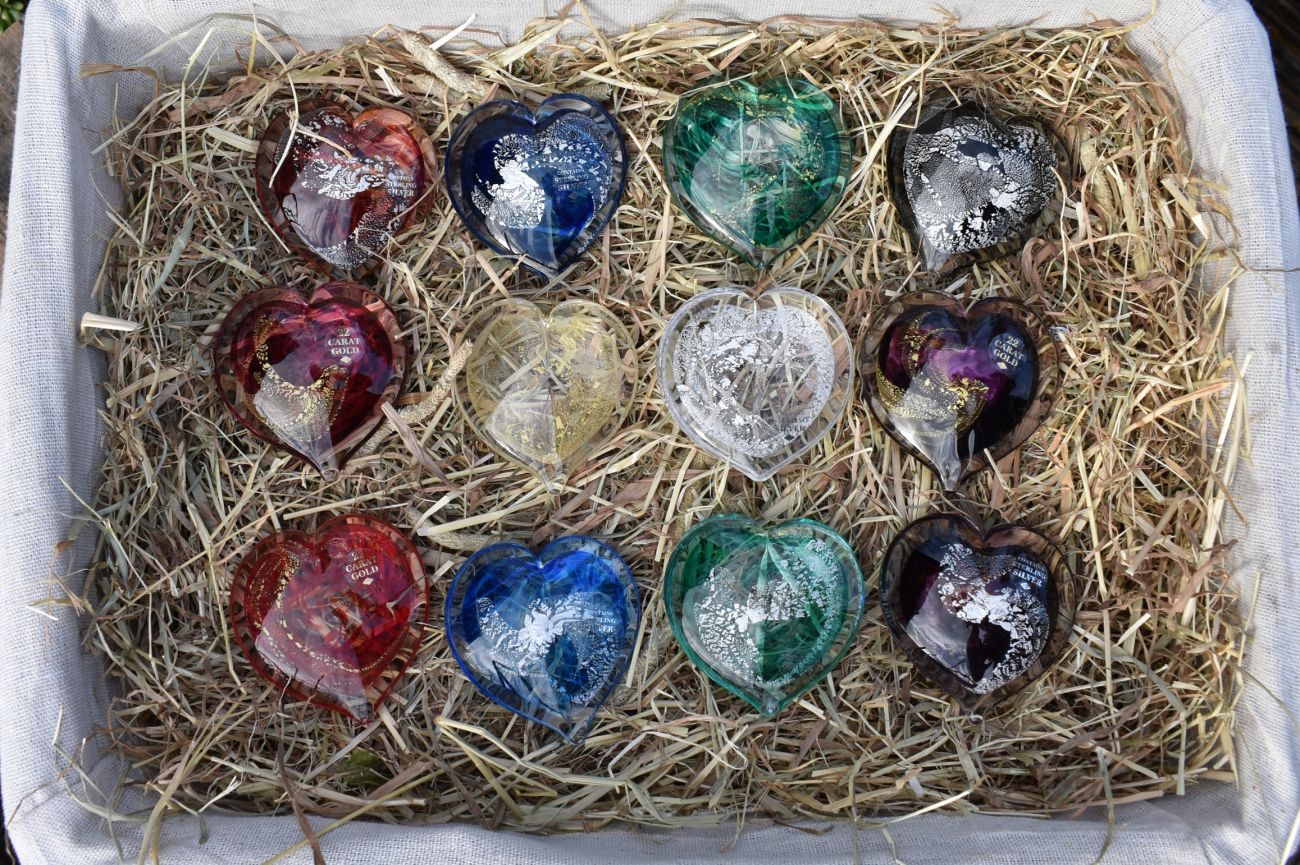Our Love Hearts have encased gold or silver leaf in the glass and are approx 6cm across.