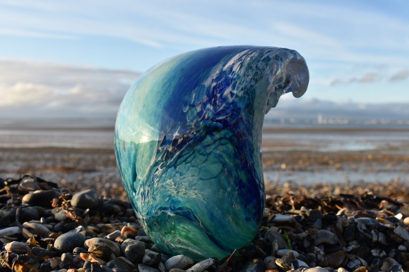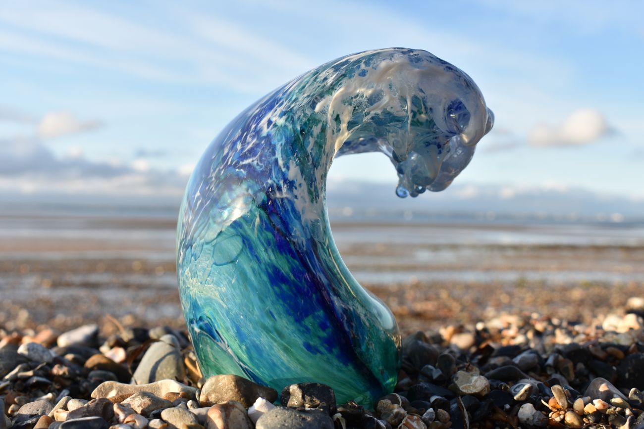 Hand blown and sculpted with encased and surface colours to capture the powerful nature of the sea.