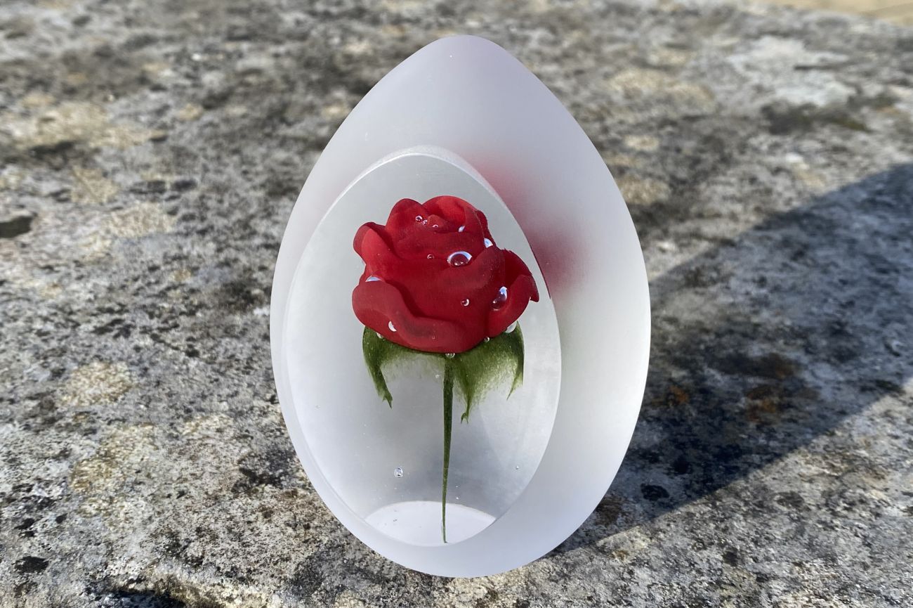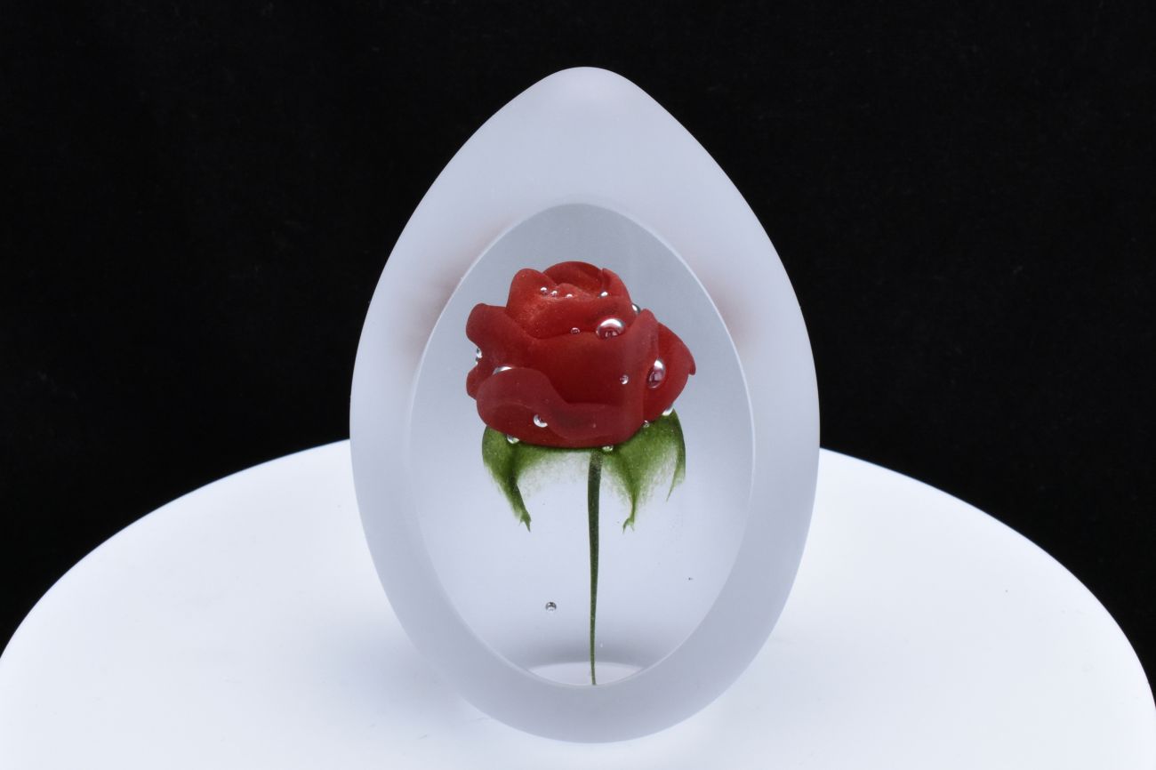 Hand sculpted from molten glass by Perron, this beautiful rose sits within a clear window of this oval paperweight.
