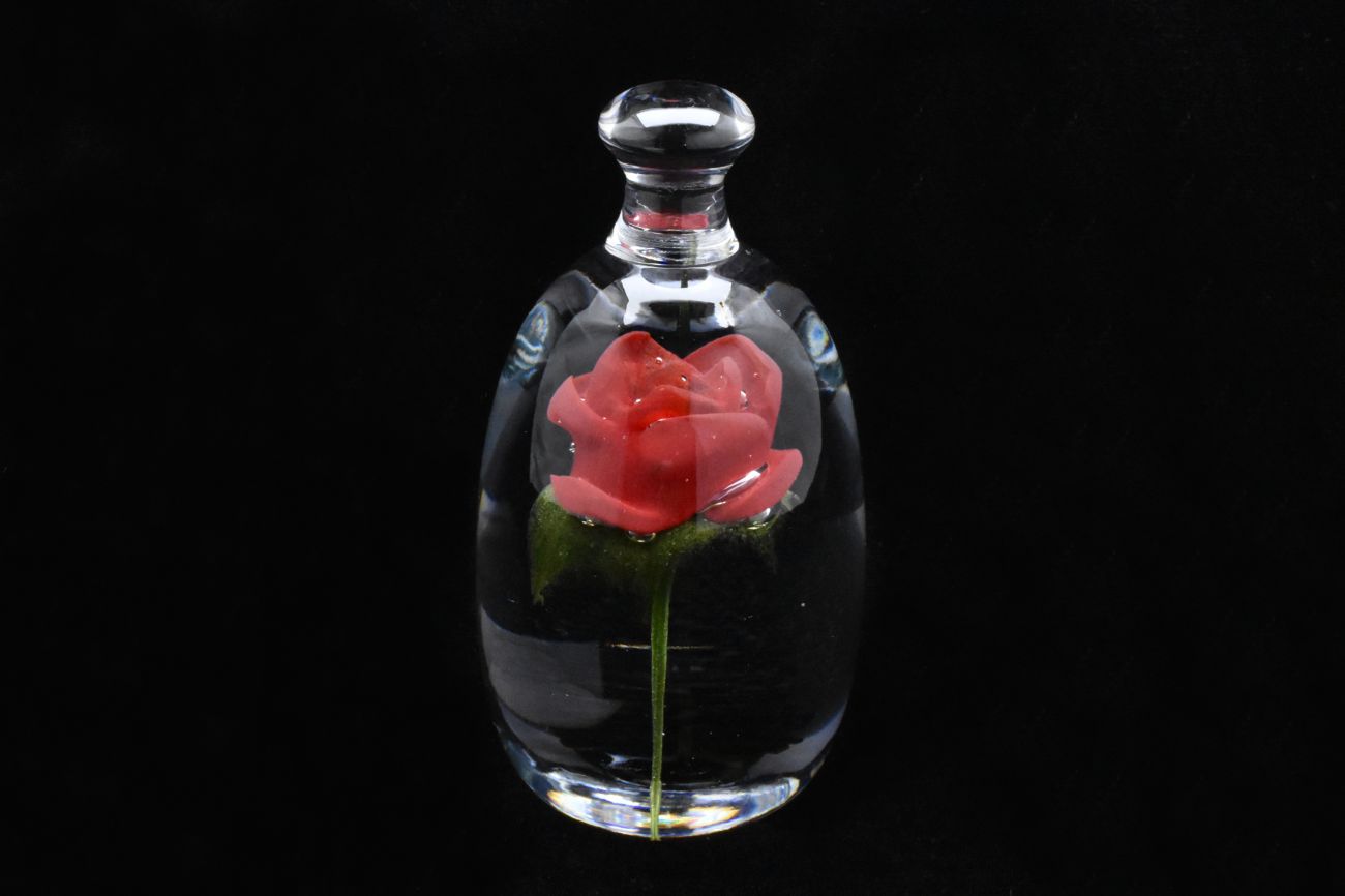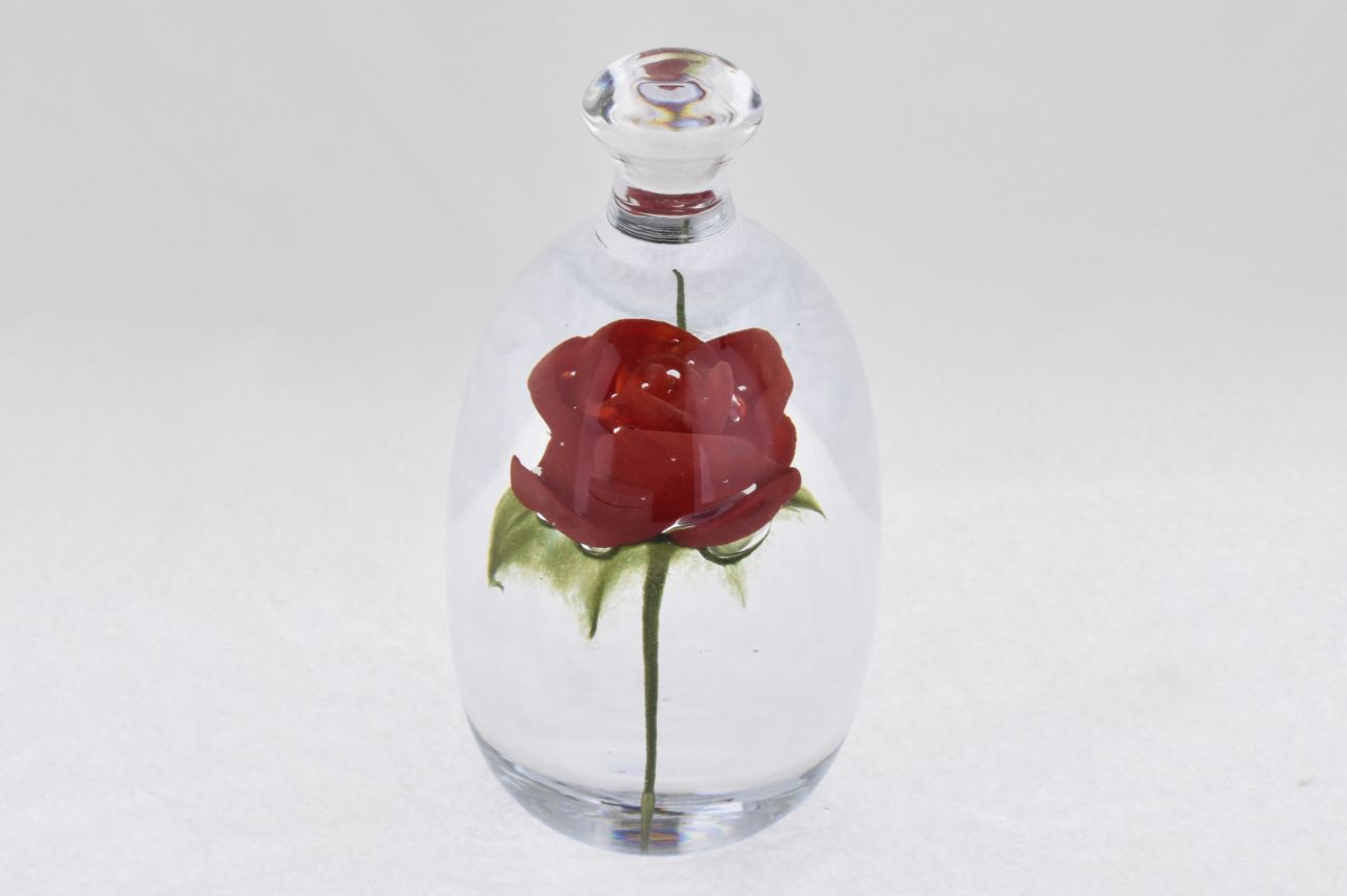 Hand sculpted by Perron, this beautiful red rose is held within this solid clear glass bell jar.