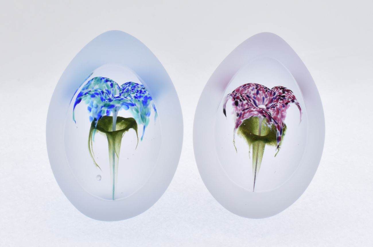 These beautiful flower paperweights have a frosted surface with a clear oval window, in which the flower sits.