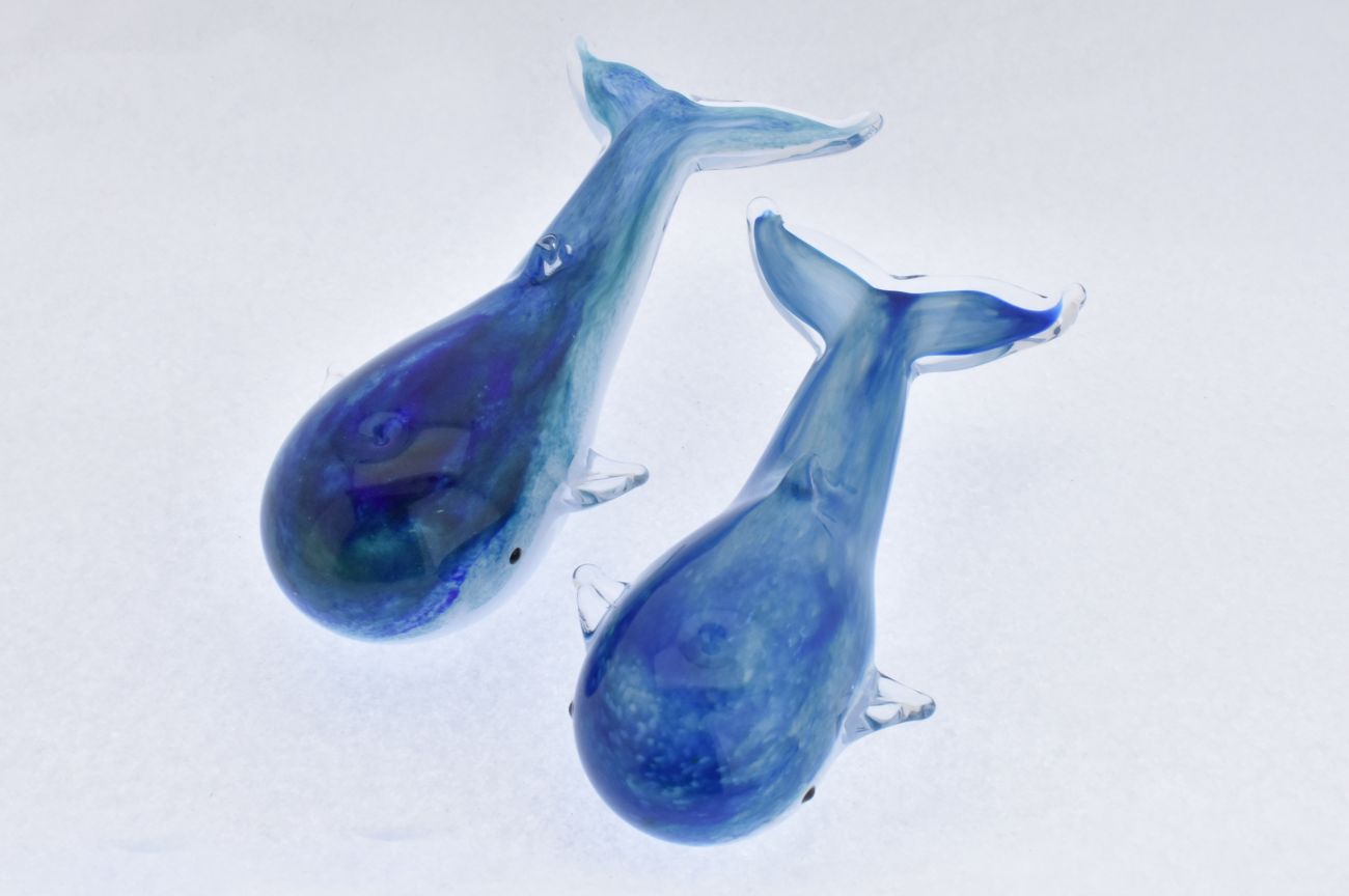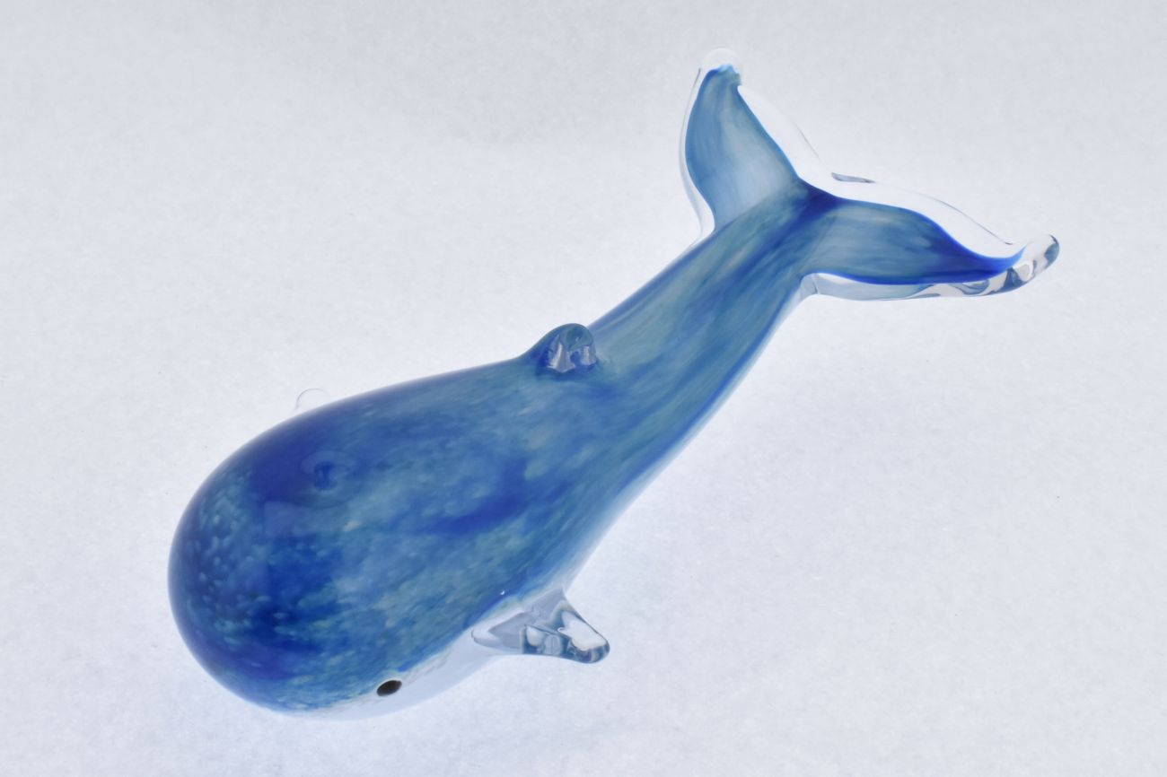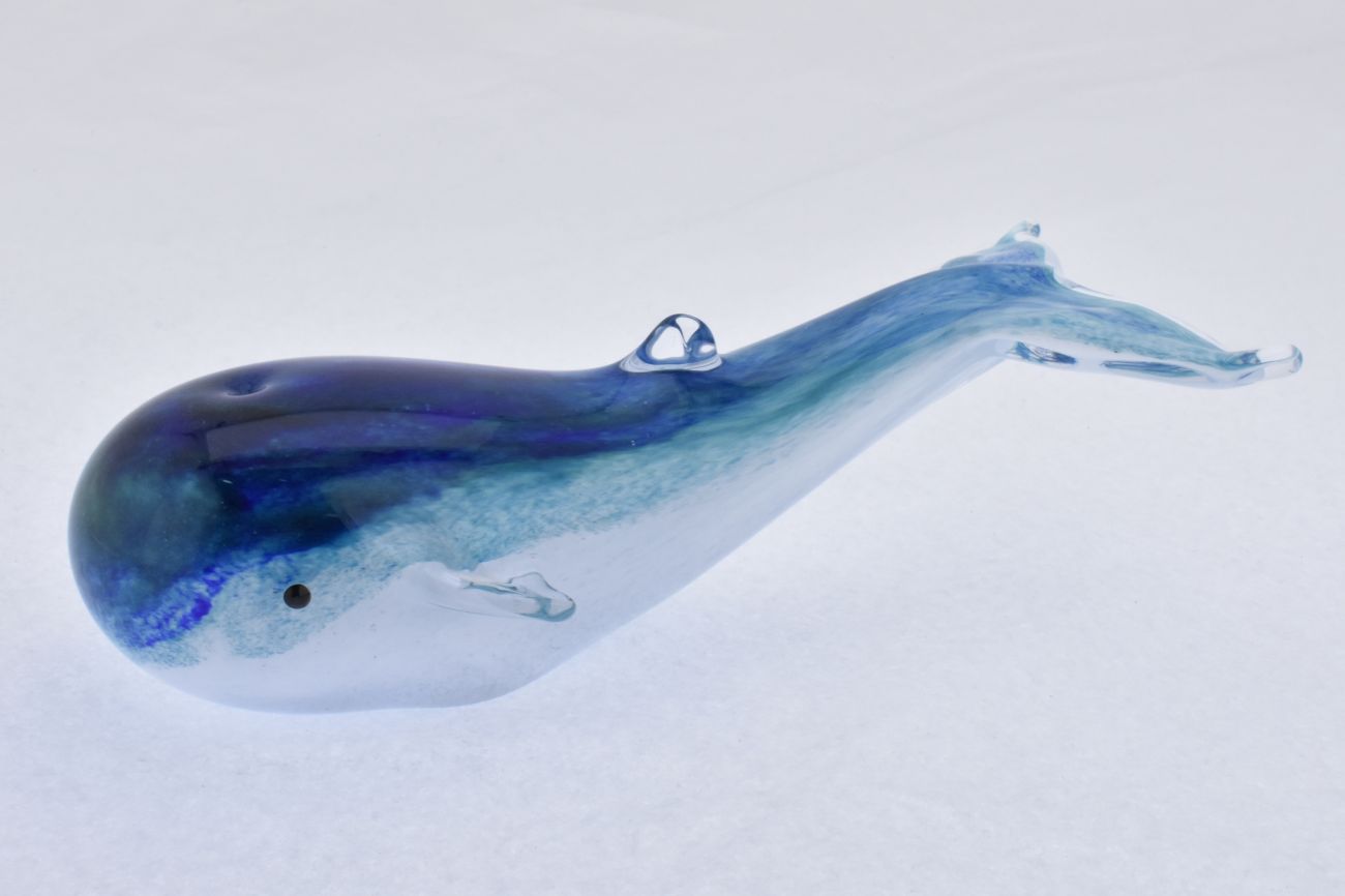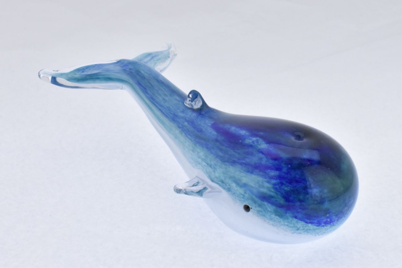 Hand sculpted from hot fluid glass this blue whale has a lovely flowing movement. Available in dark or light ocean blues and a range of lengths. The largest piece is blown.