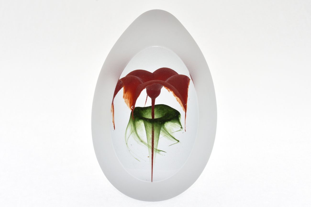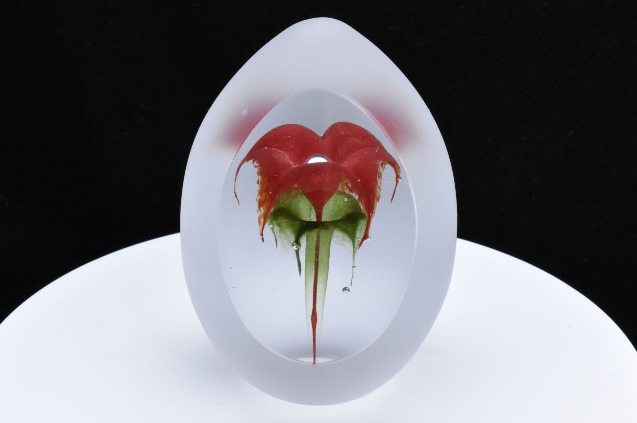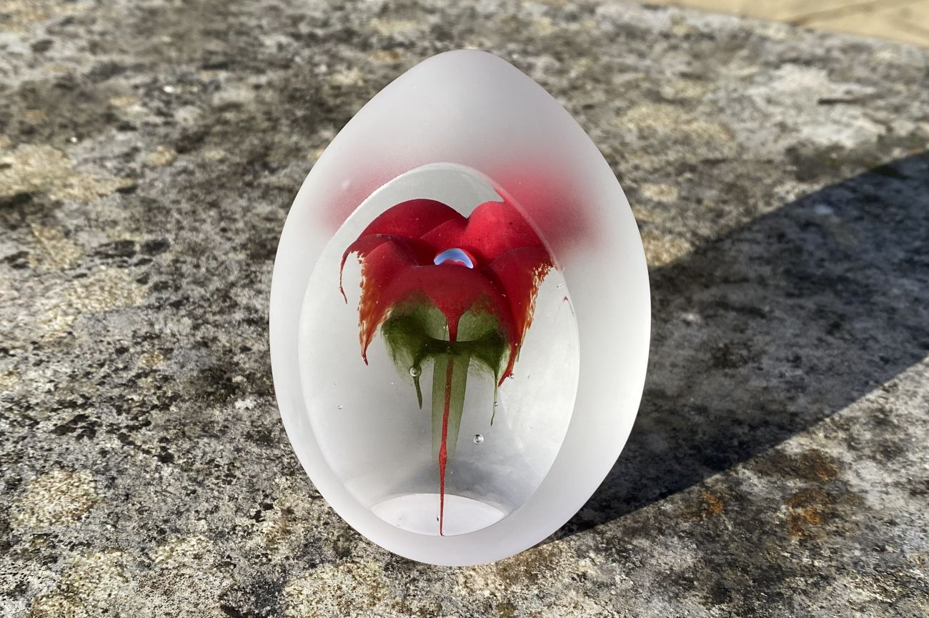 The delicate flower can be seen through a clear window cut into the frosted form.