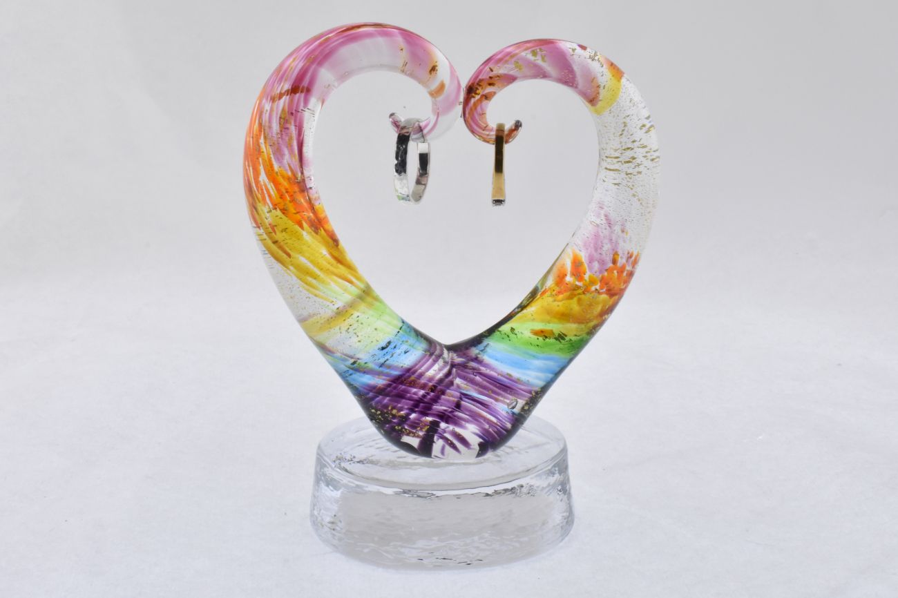 Art Glass Heart Ring Holder on an Oval Base in Rainbow and Gold