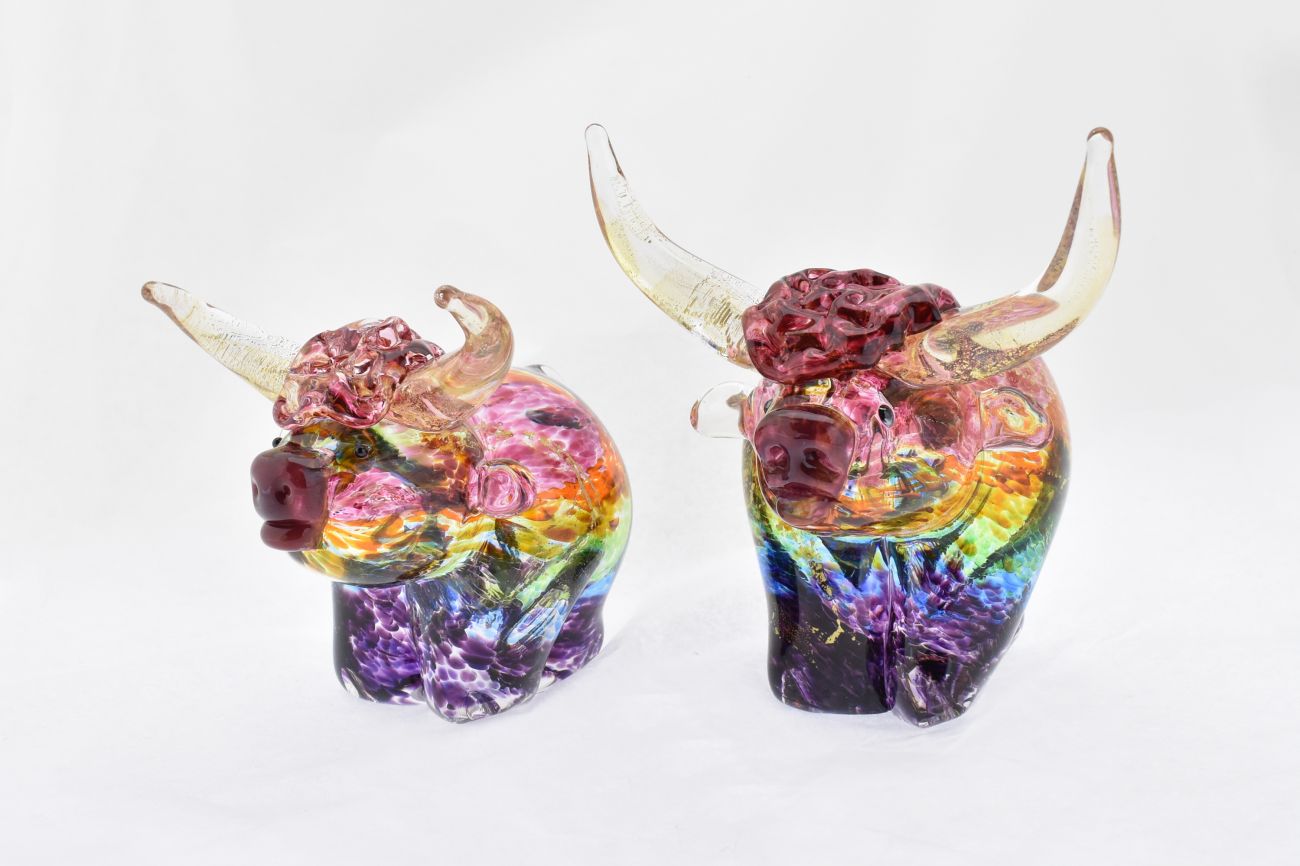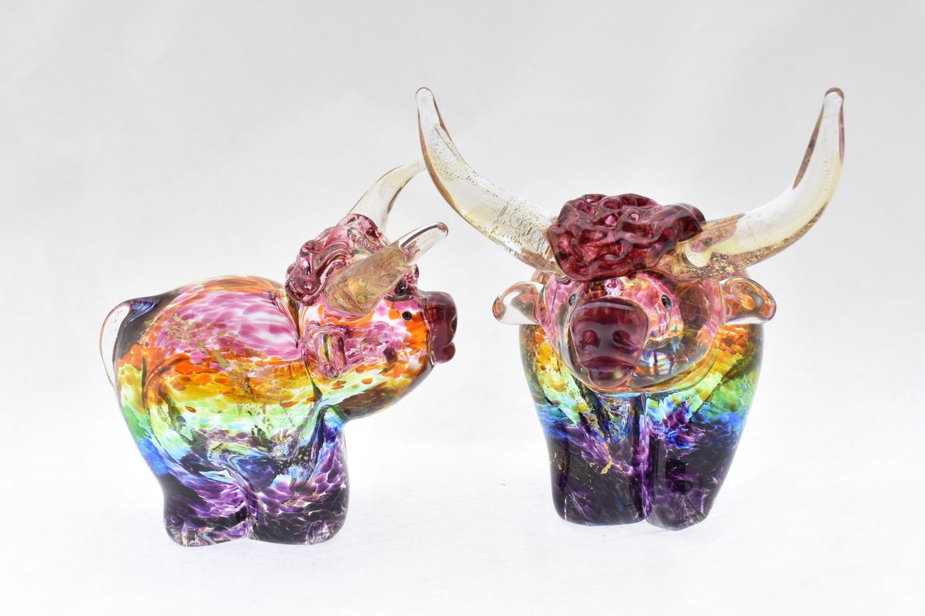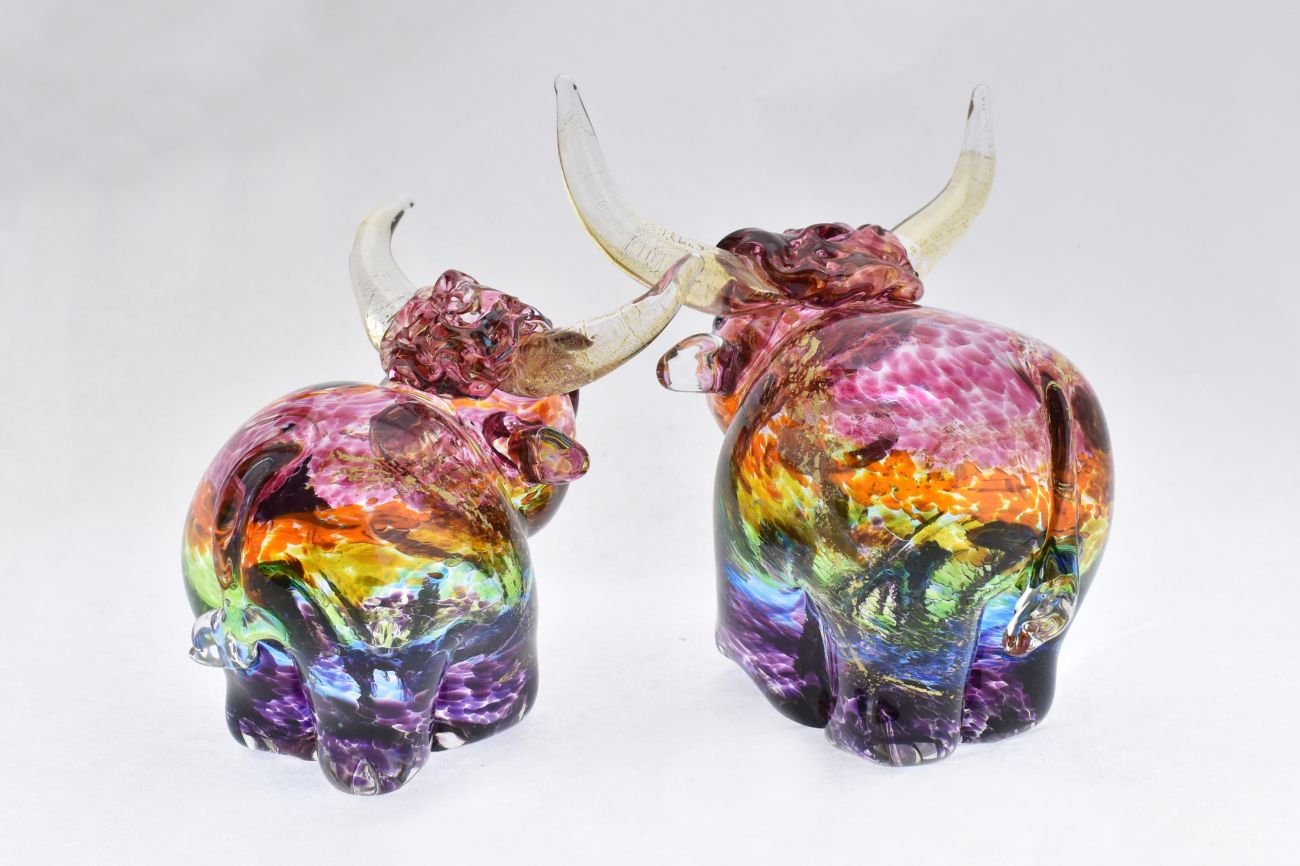 Art Glass Highland Cattle in Rainbow and Gold